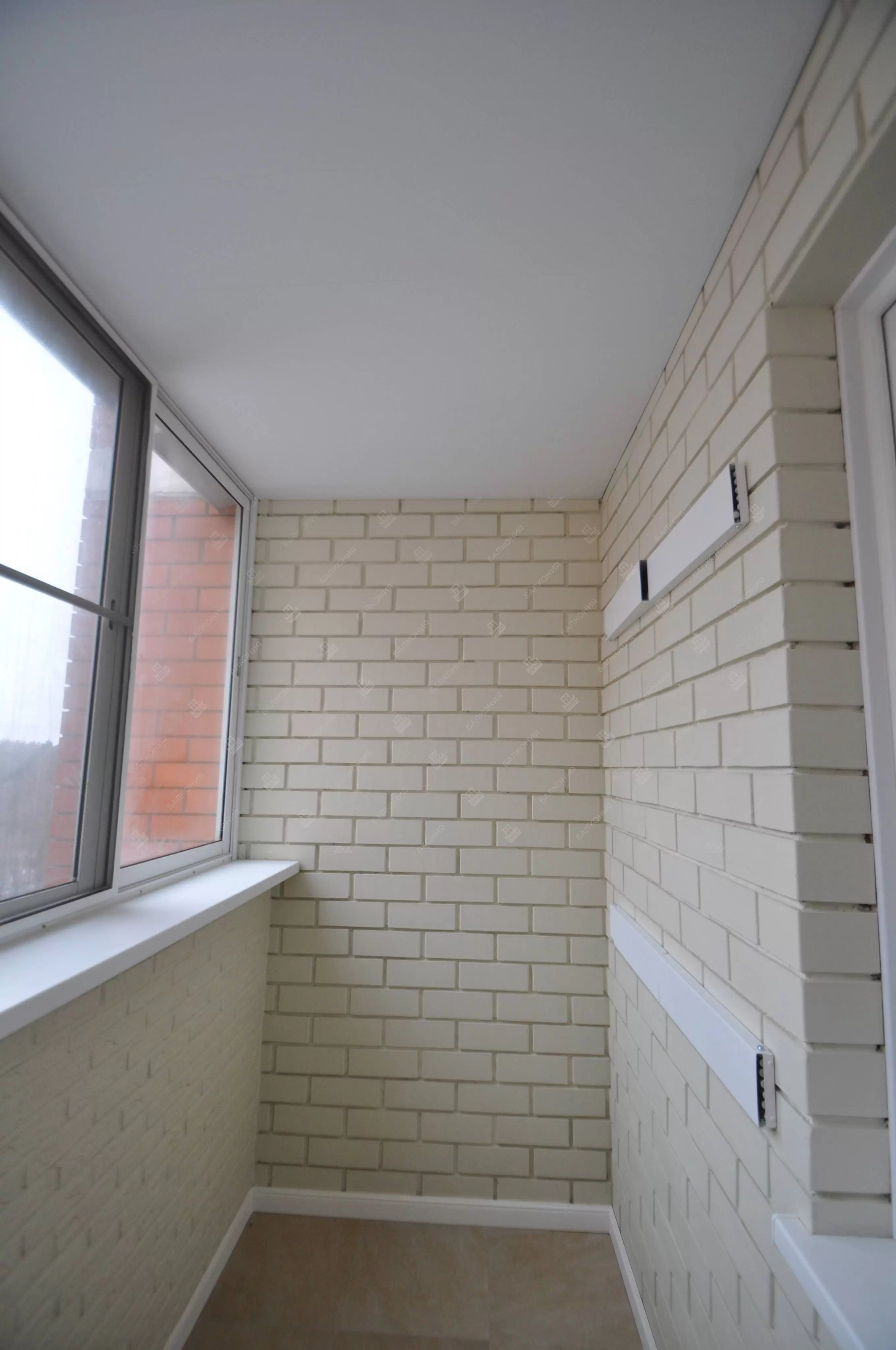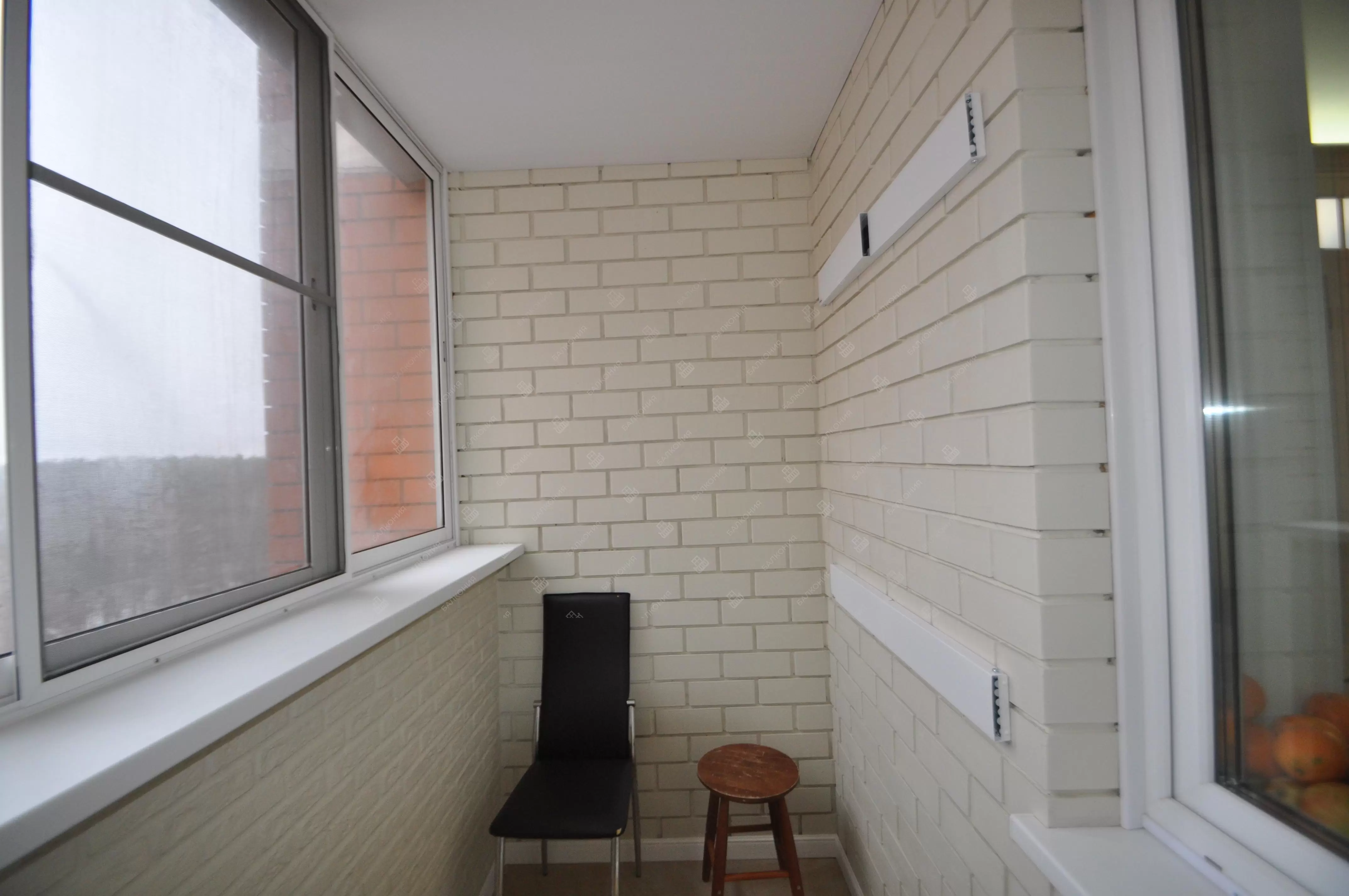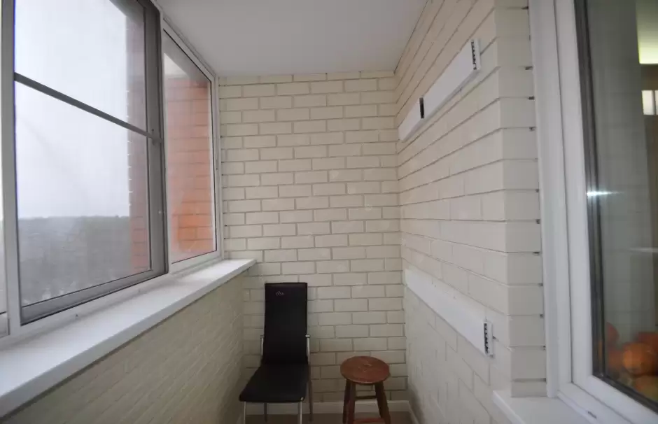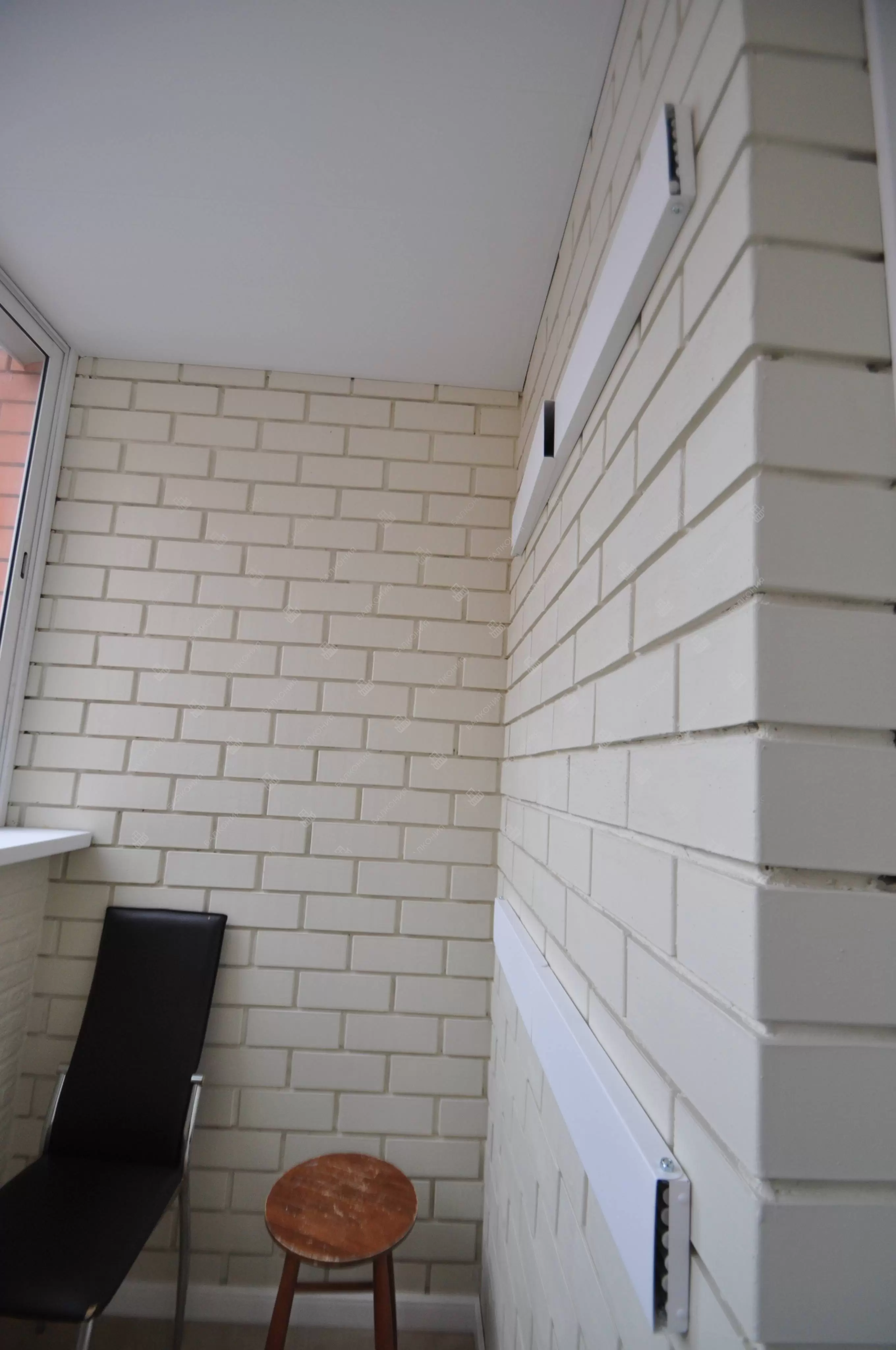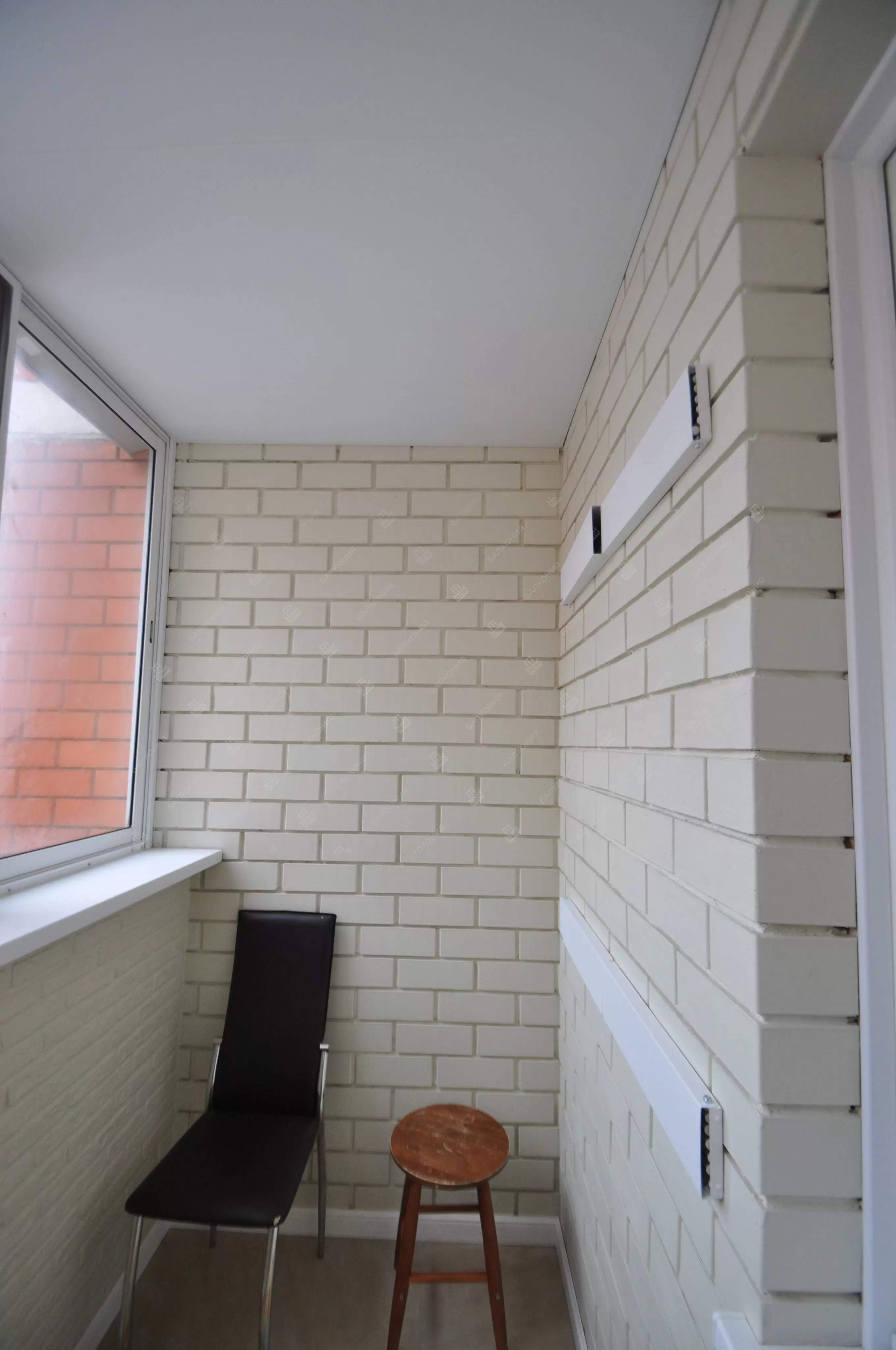 В данном объекте было выполнено решение по отделке балкона для технических нужд и хранения имущества. На место старых, деревянных рам, установлены новые алюминиевые окна. Отделка стен выполнена декоративным камнем «имитация кирпича», потолок — покраска, пол — плитка.