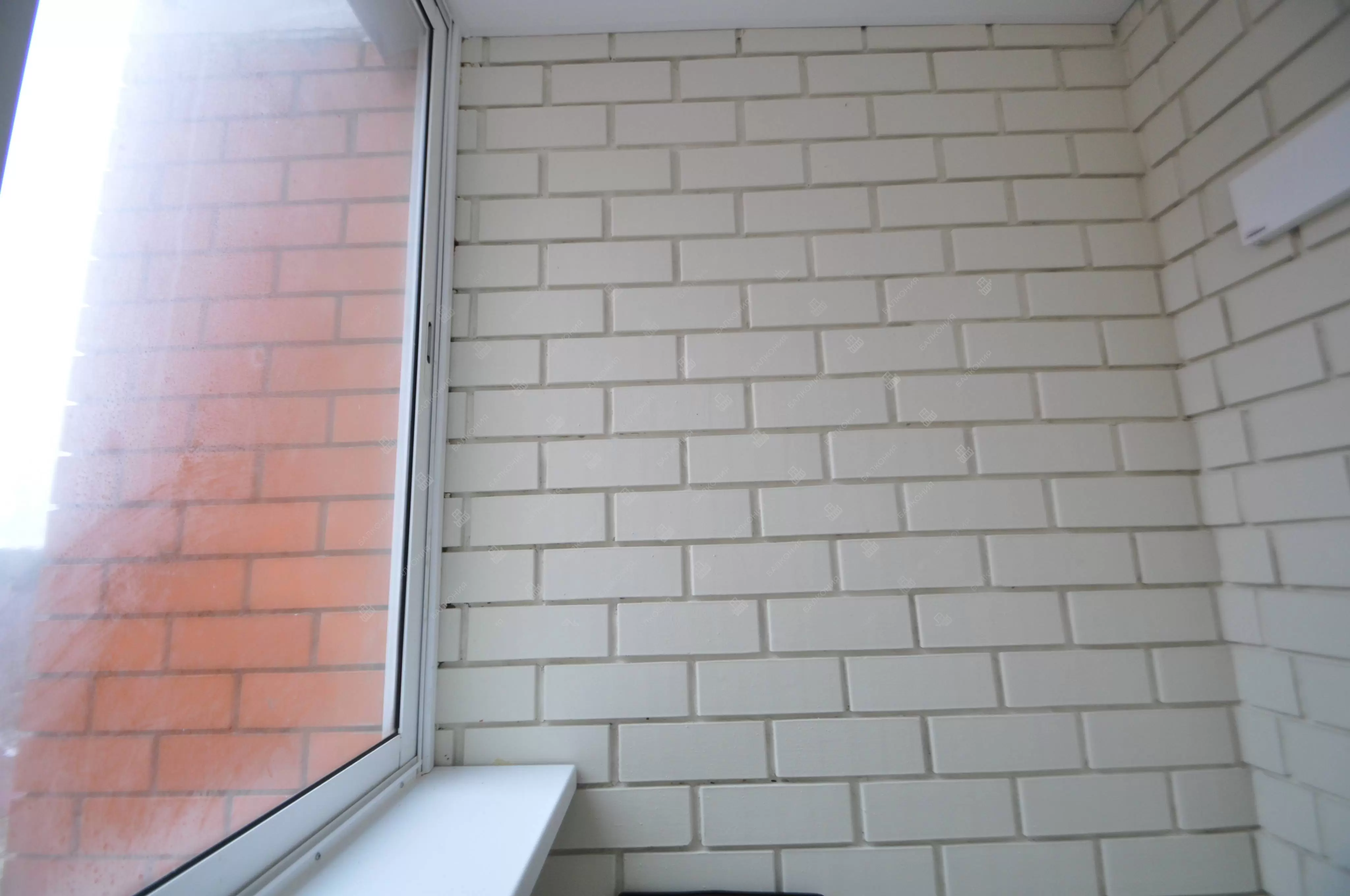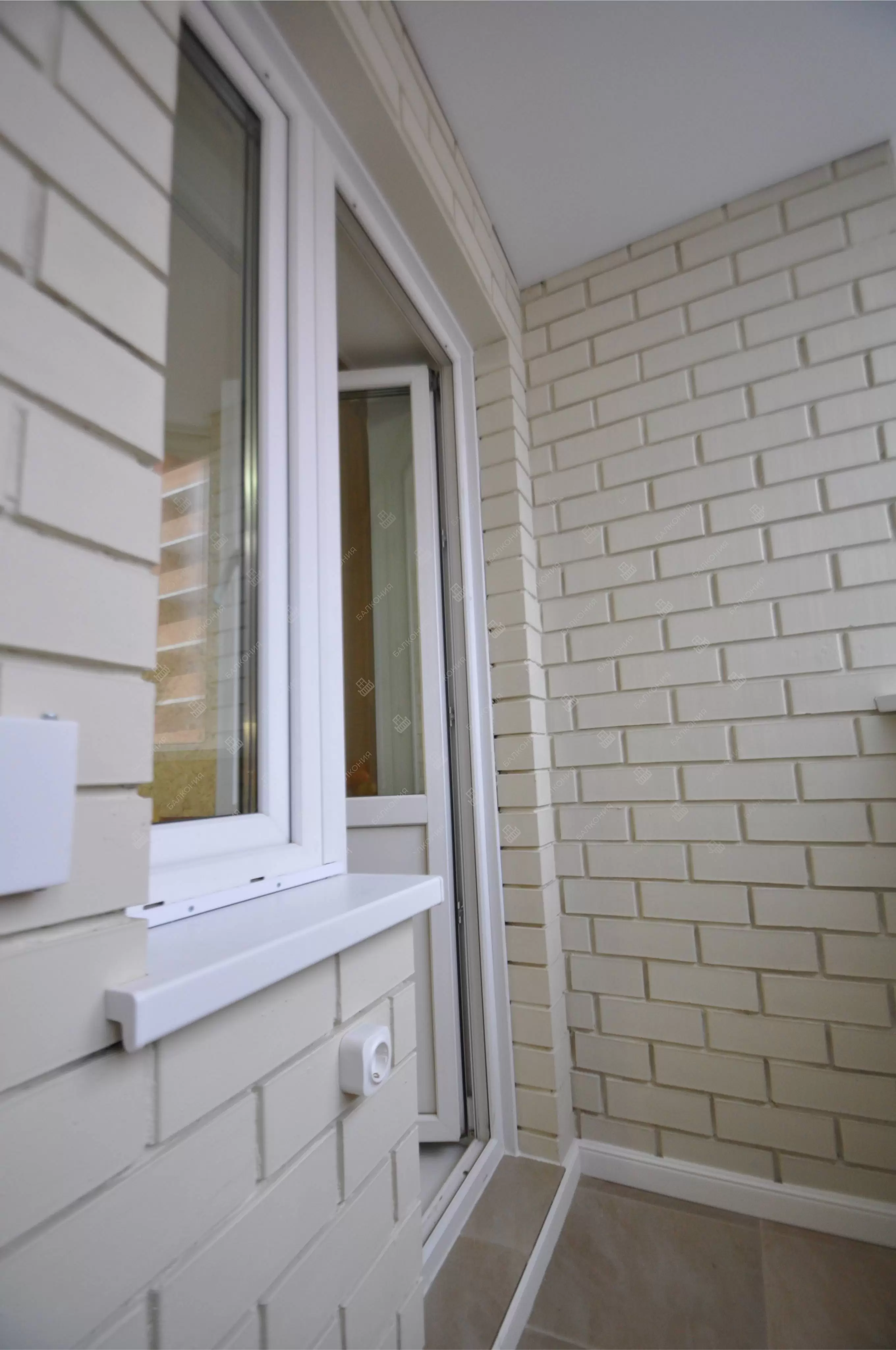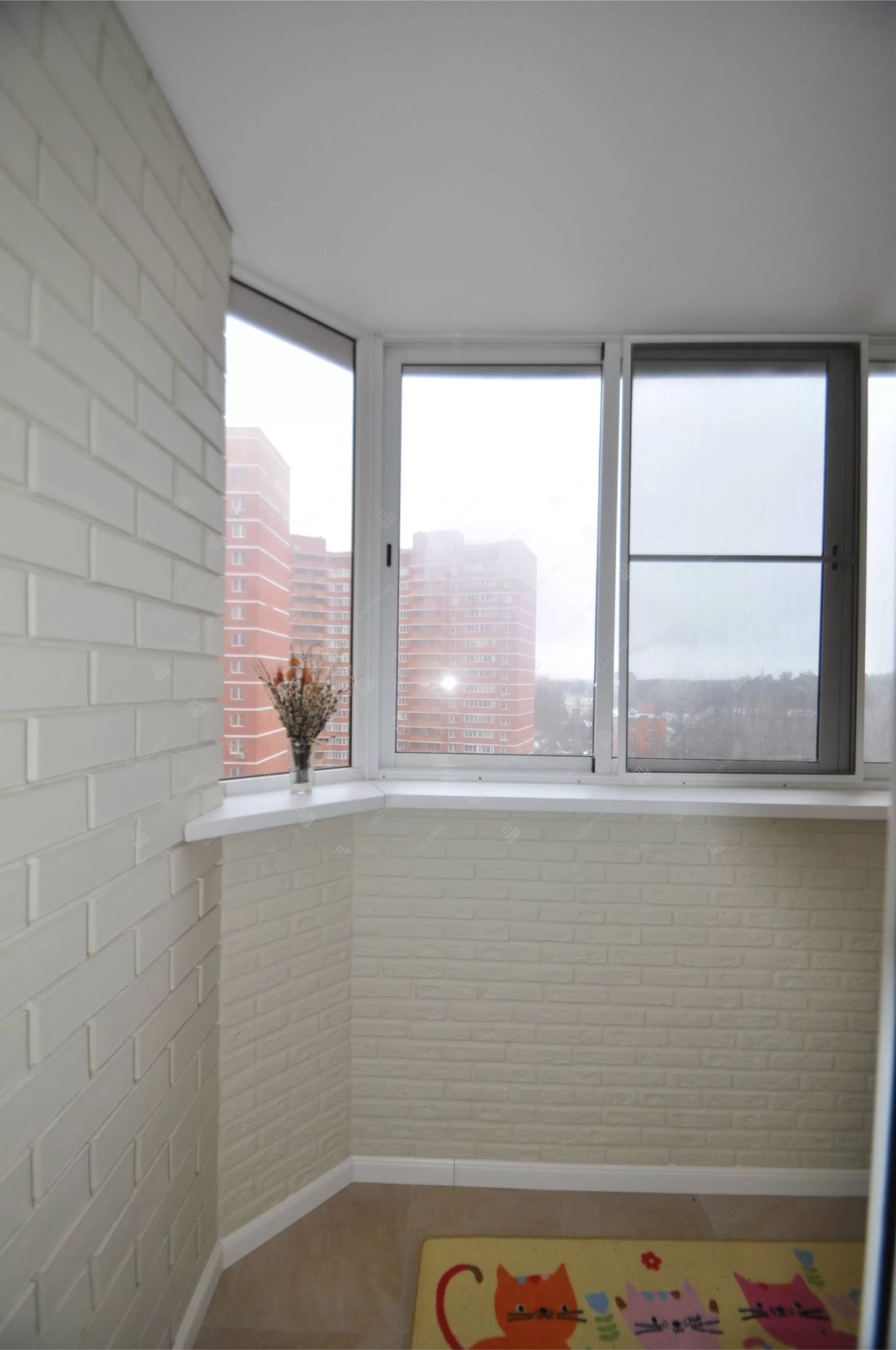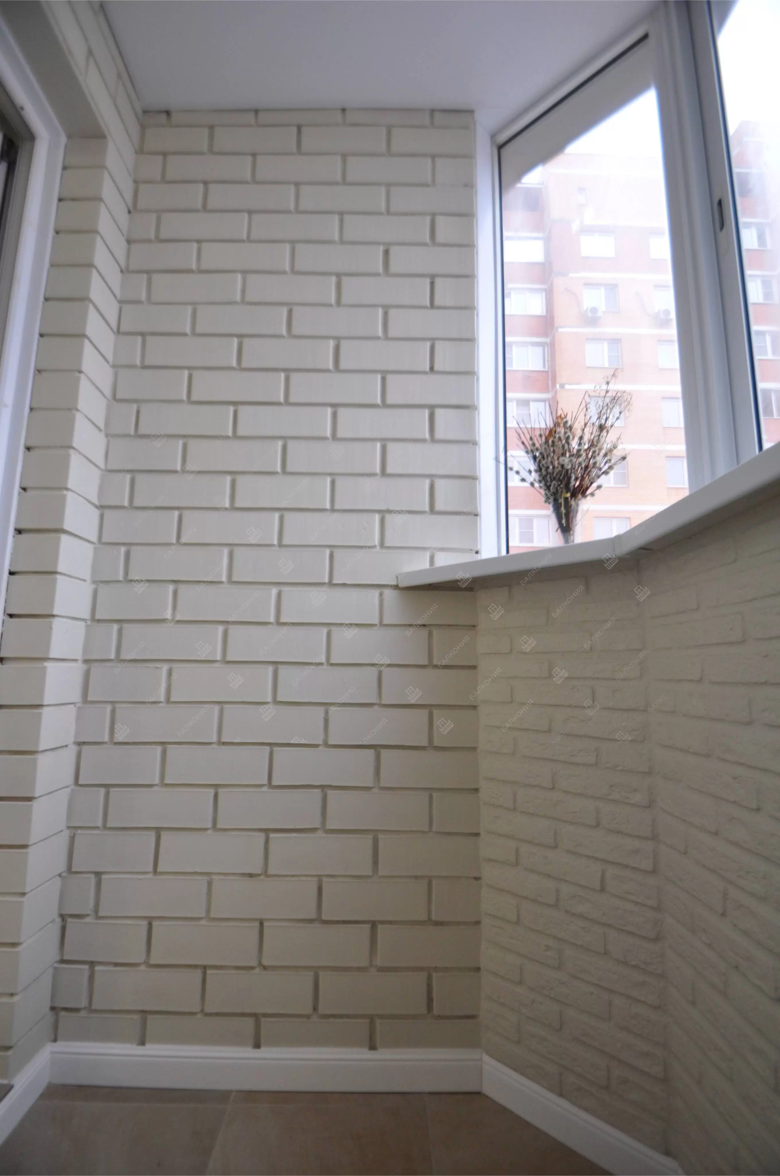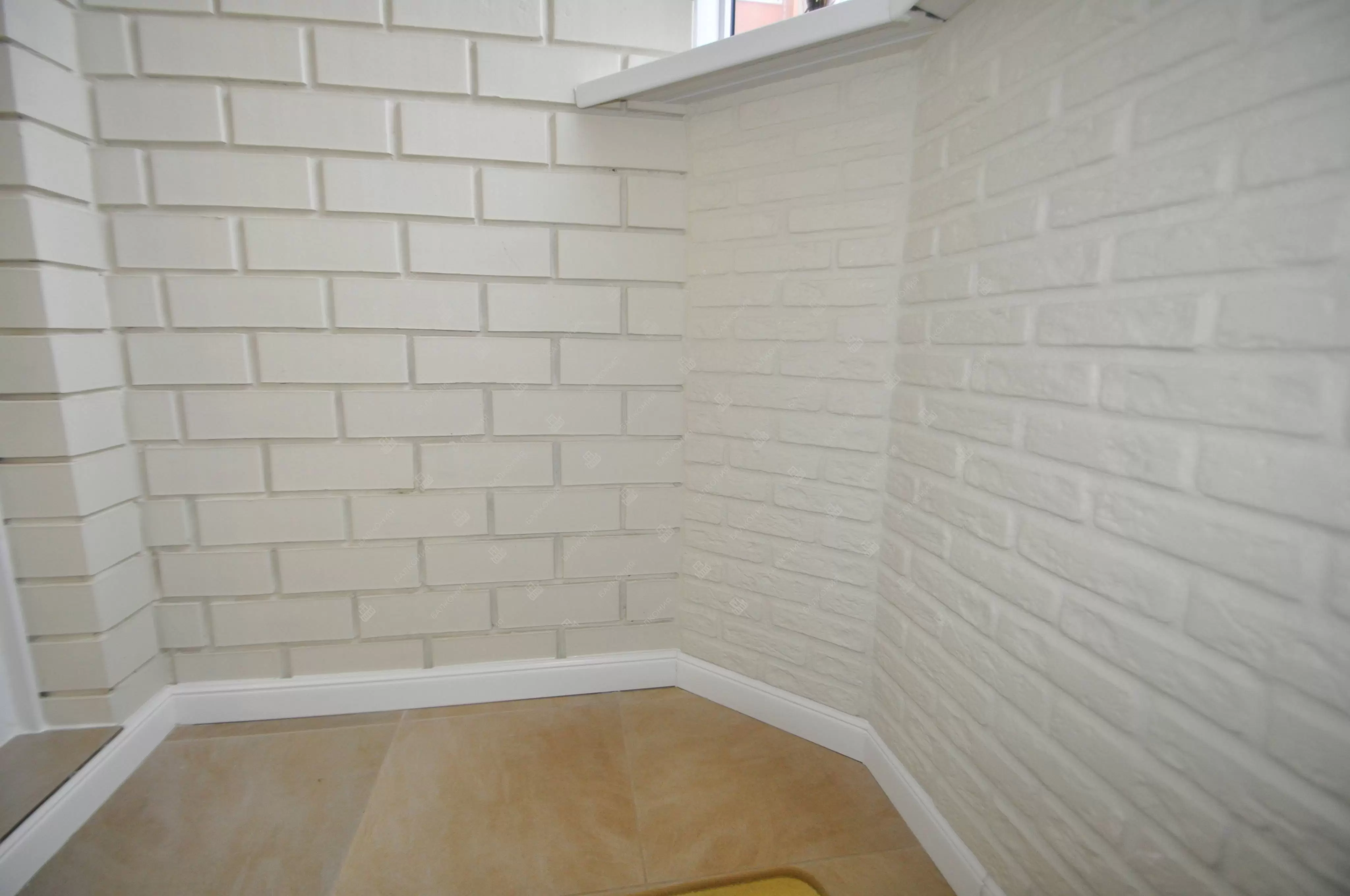 В данном объекте было выполнено решение по отделке балкона для технических нужд и хранения имущества. На место старых, деревянных рам, установлены новые алюминиевые окна. Отделка стен выполнена декоративным камнем «имитация кирпича», потолок — покраска, пол — плитка.