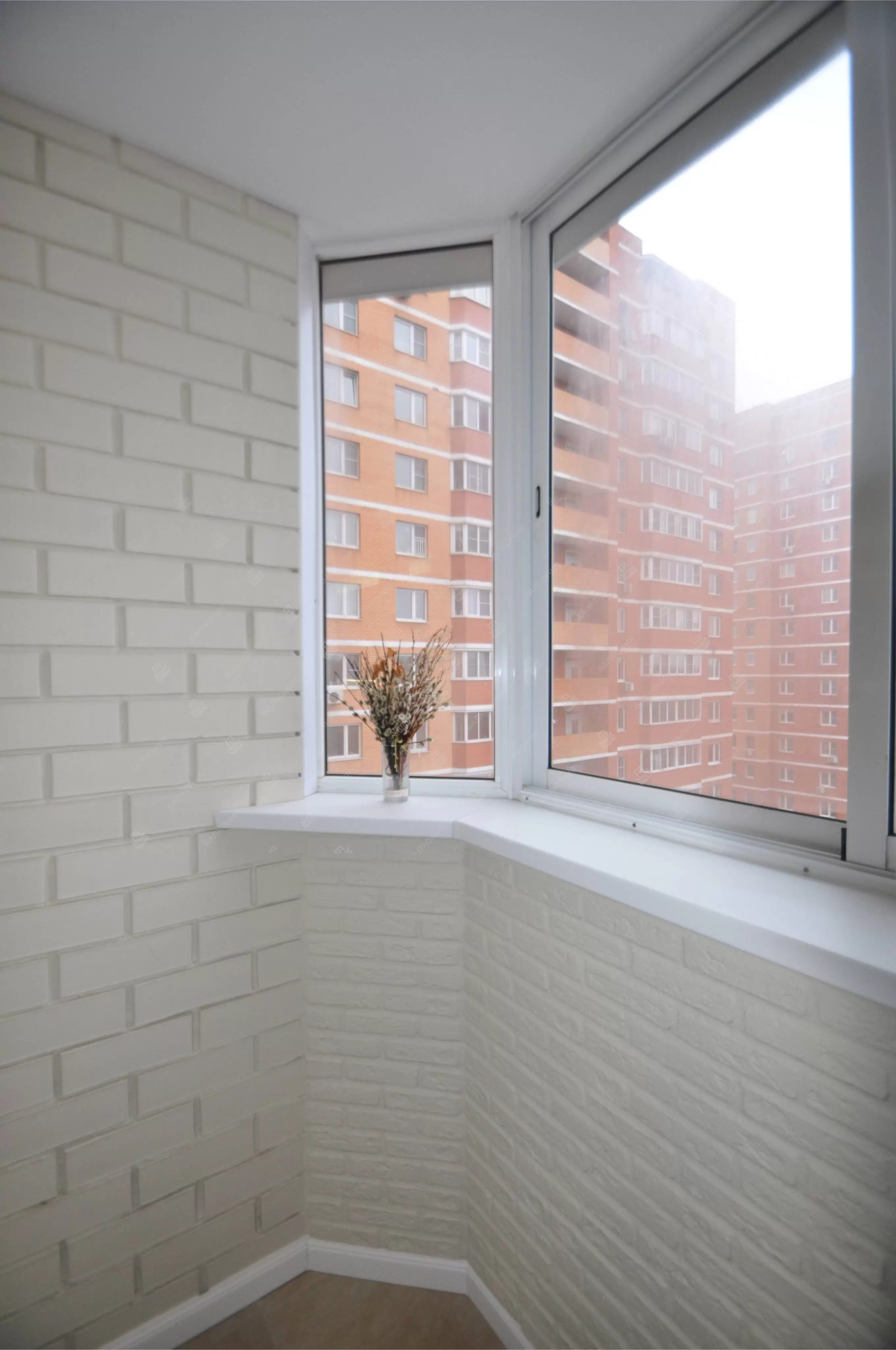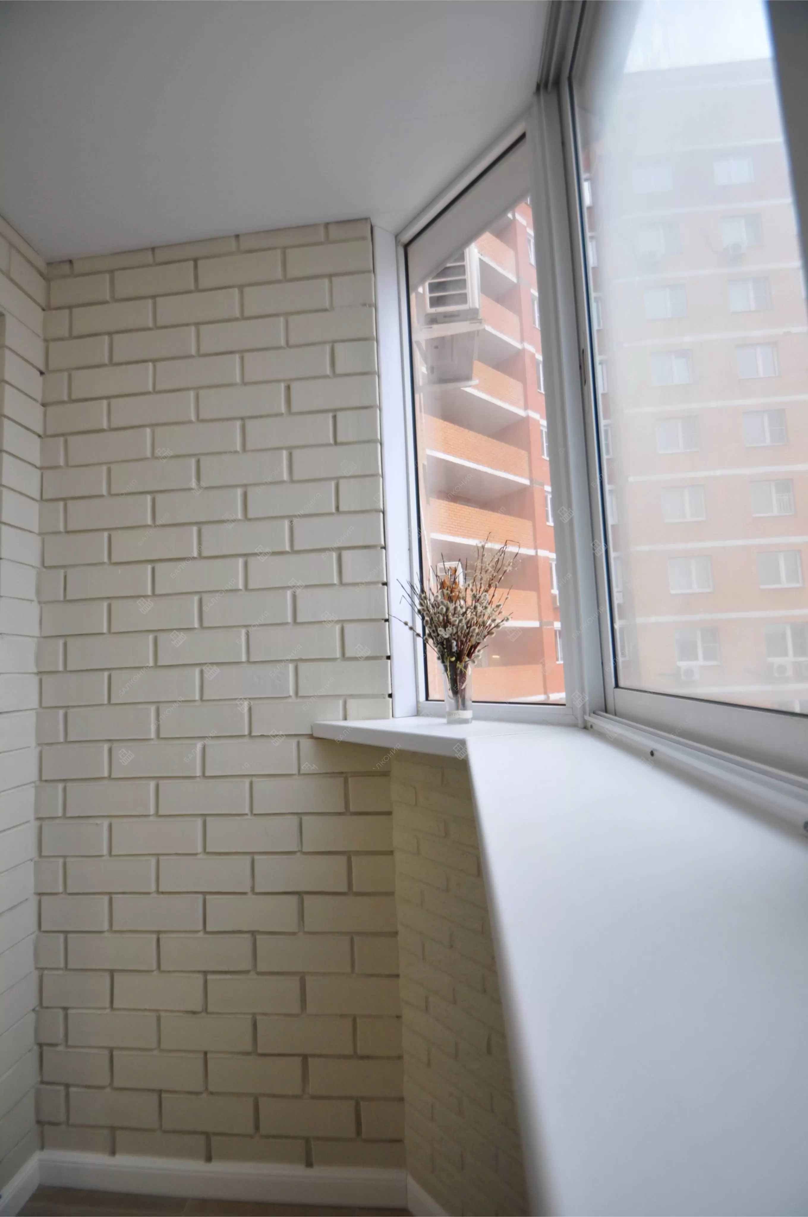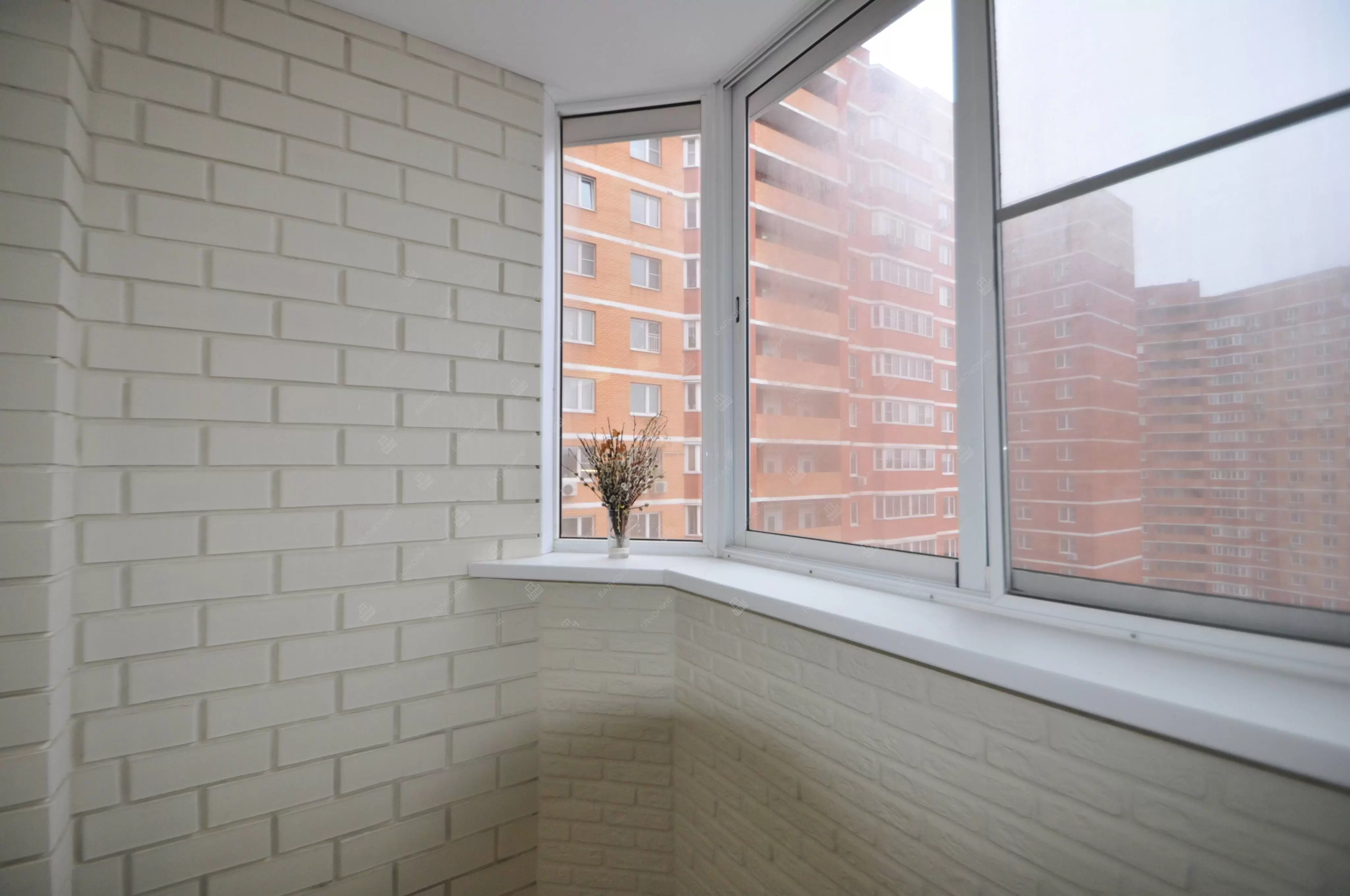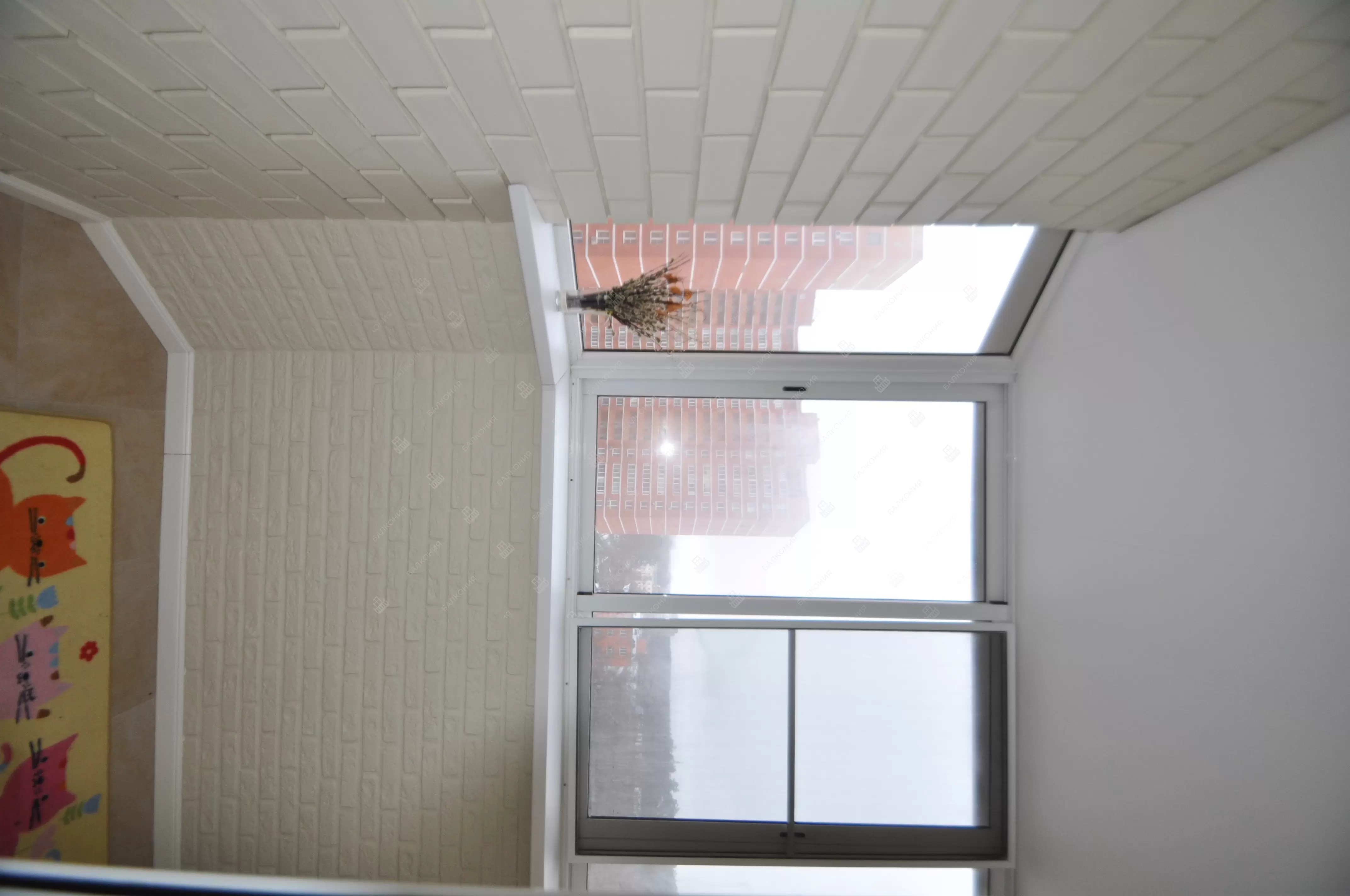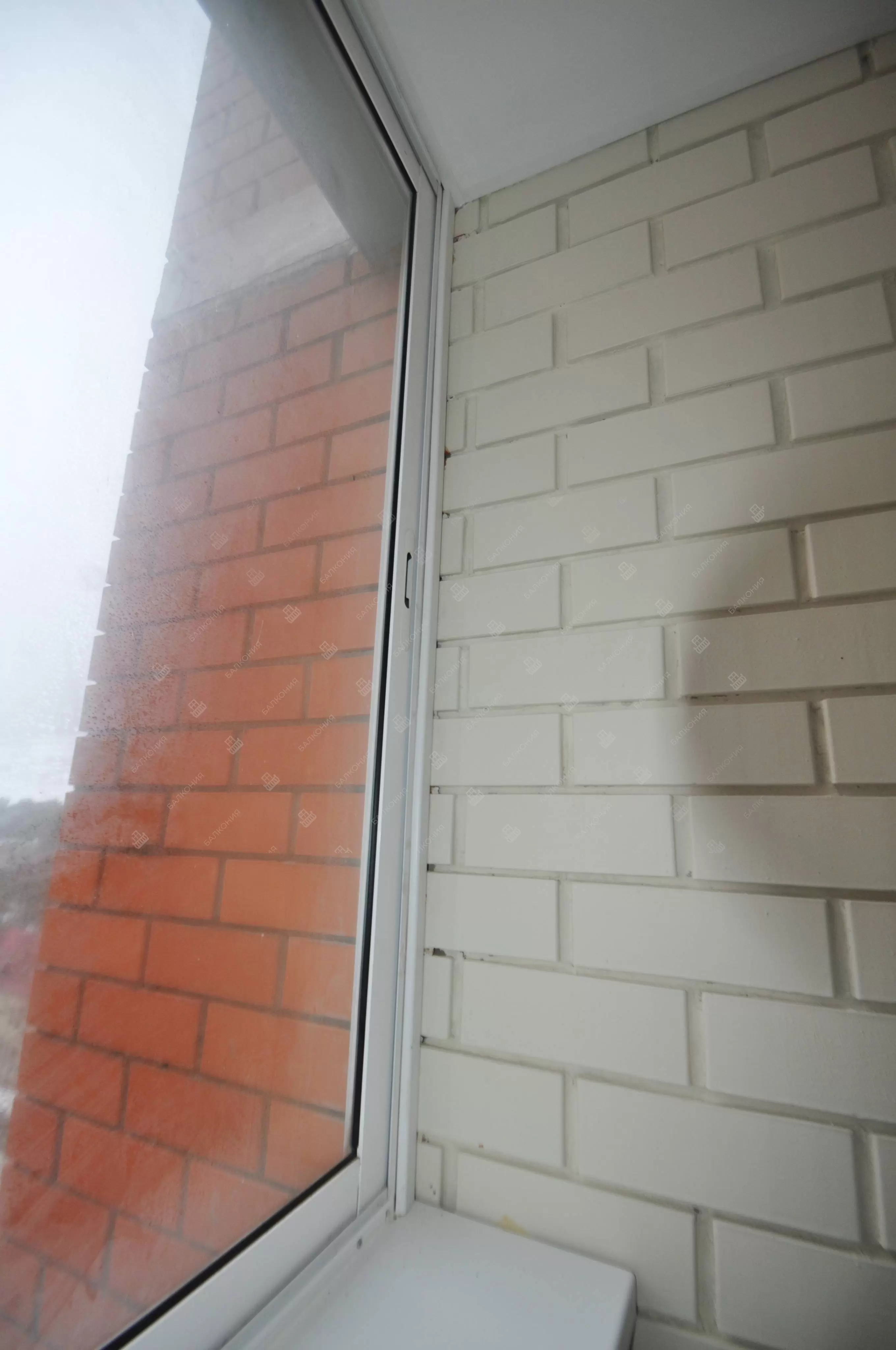 В данном объекте было выполнено решение по отделке балкона для технических нужд и хранения имущества. На место старых, деревянных рам, установлены новые алюминиевые окна. Отделка стен выполнена декоративным камнем «имитация кирпича», потолок — покраска, пол — плитка.
