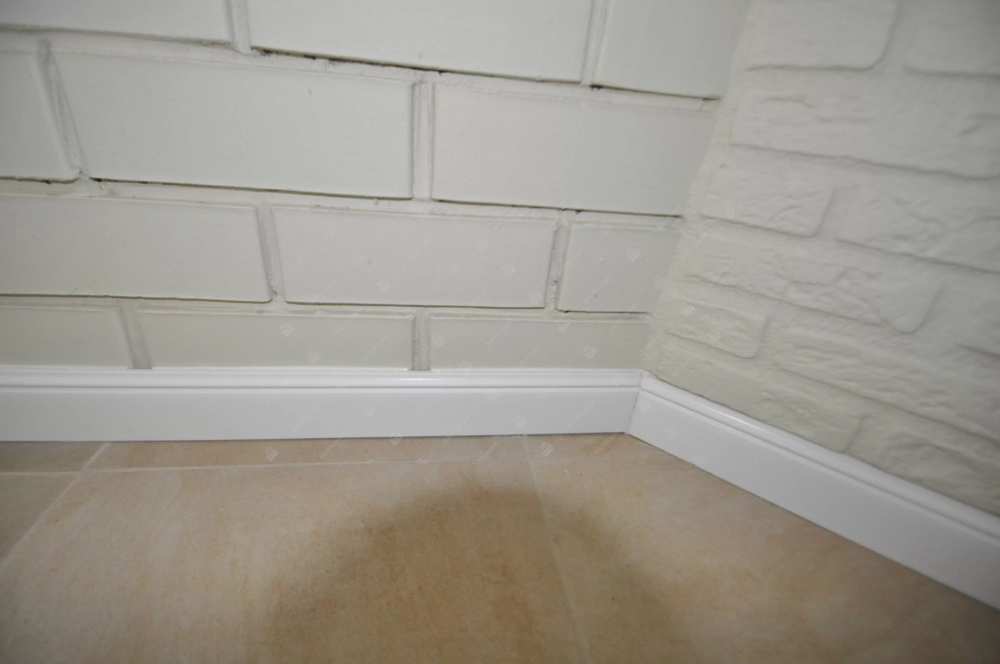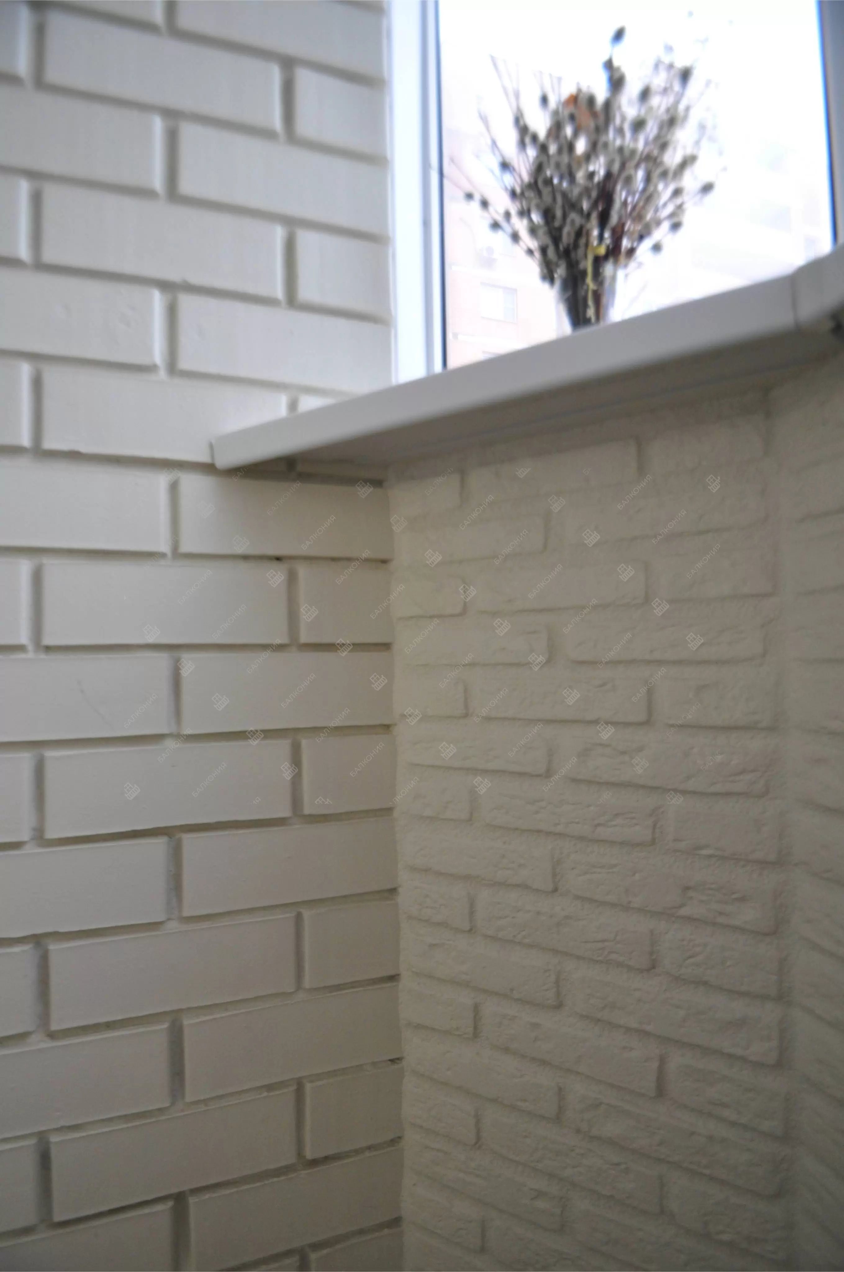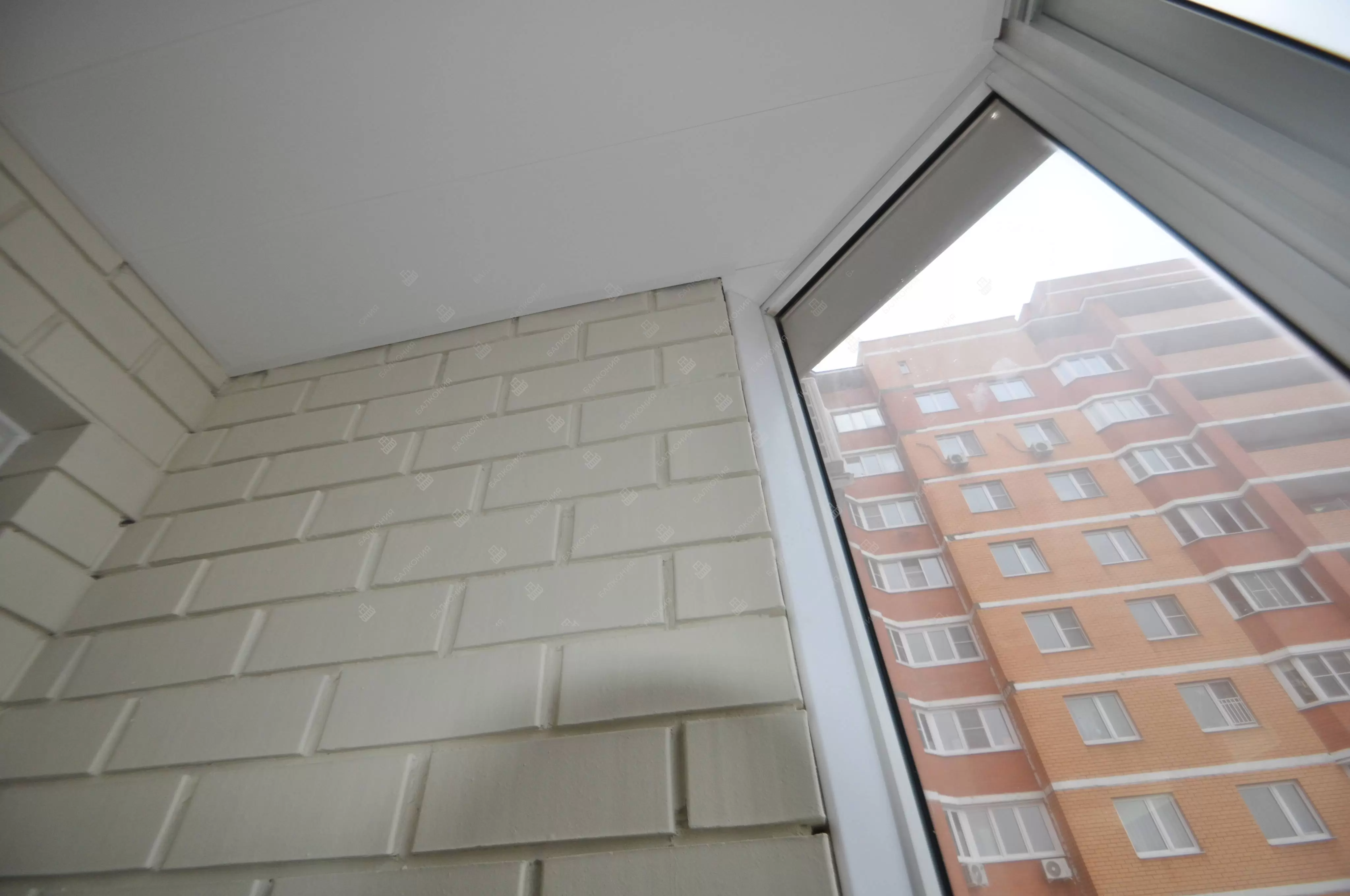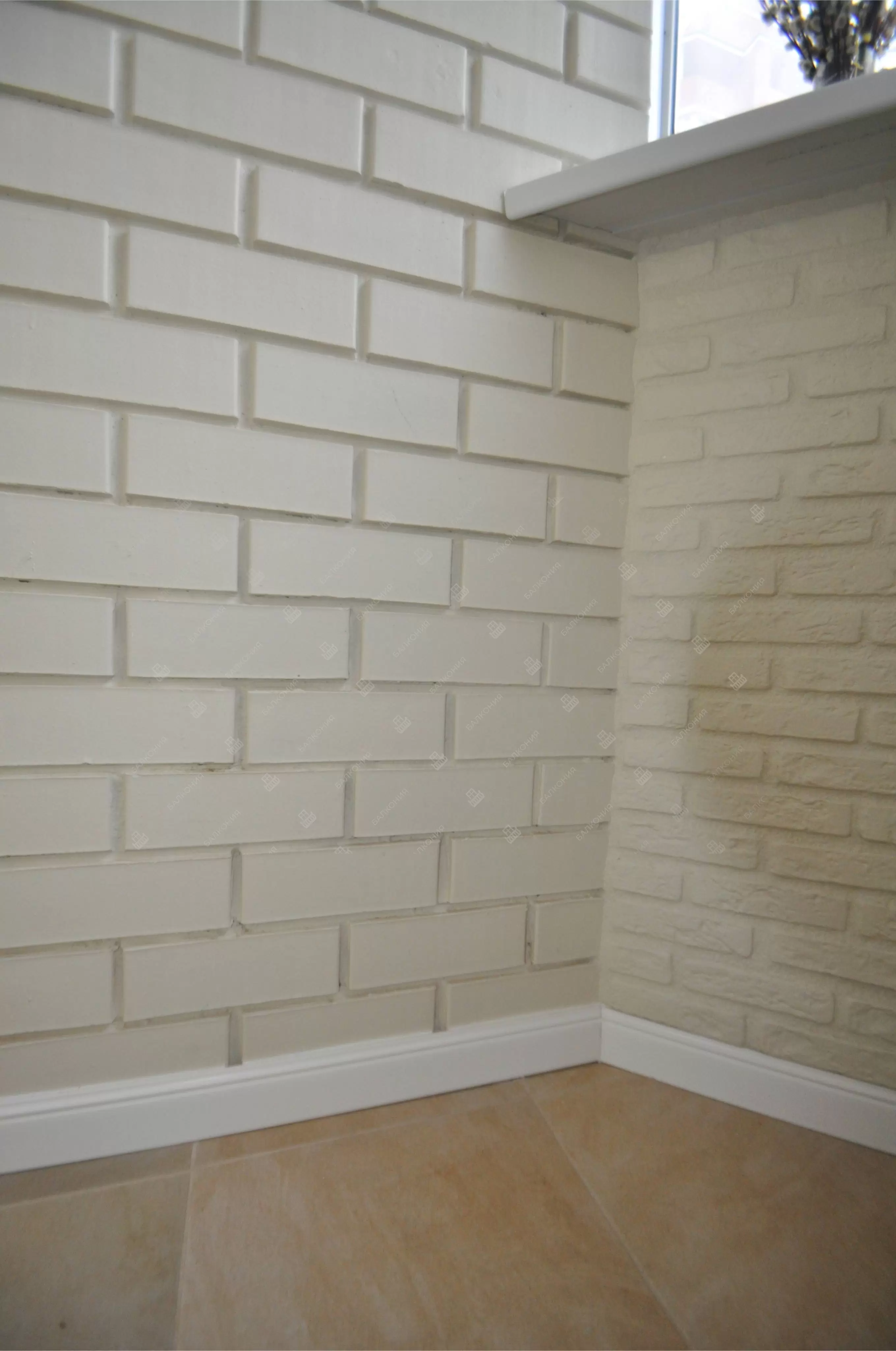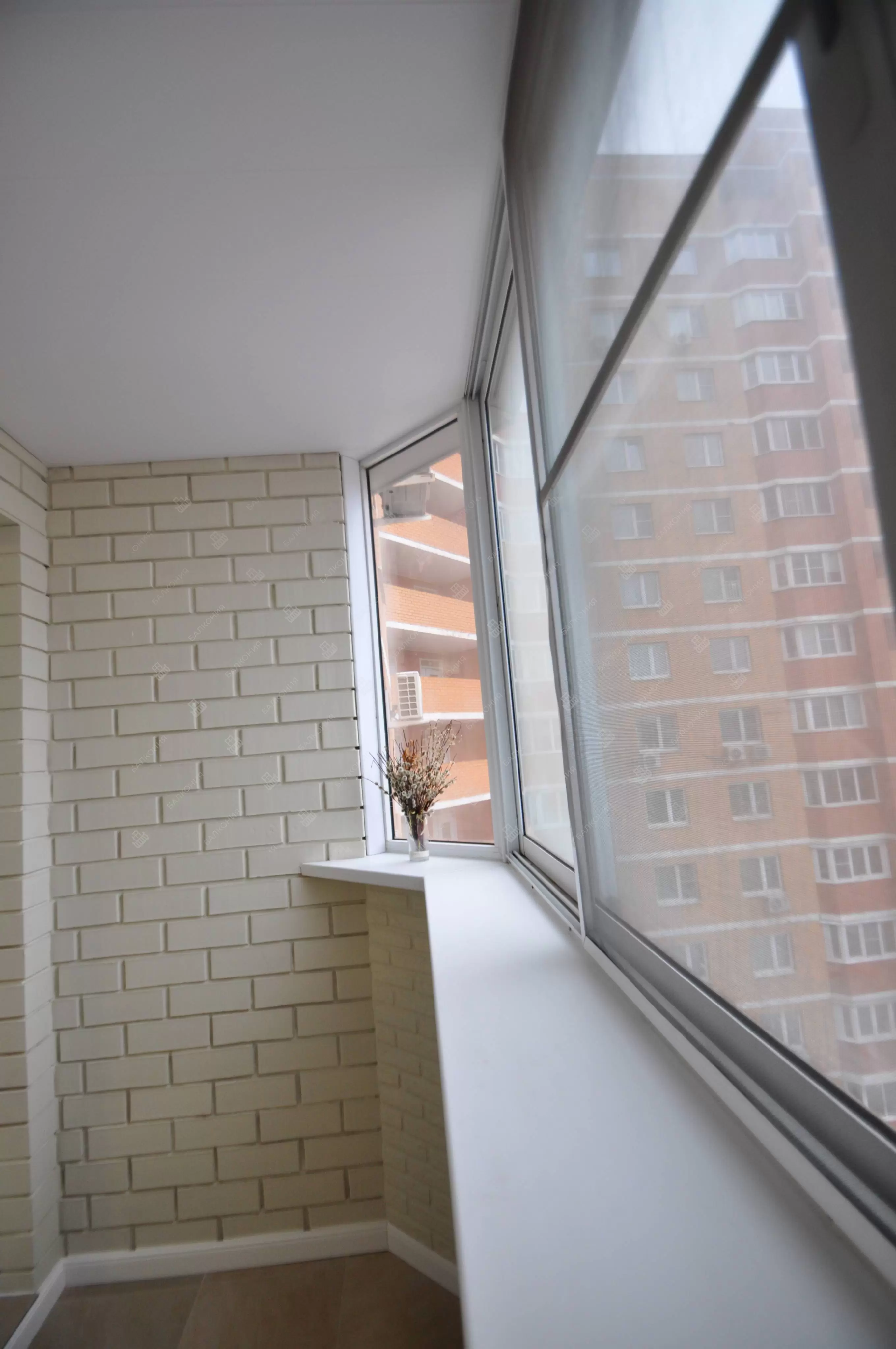 В данном объекте было выполнено решение по отделке балкона для технических нужд и хранения имущества. На место старых, деревянных рам, установлены новые алюминиевые окна. Отделка стен выполнена декоративным камнем «имитация кирпича», потолок — покраска, пол — плитка.
