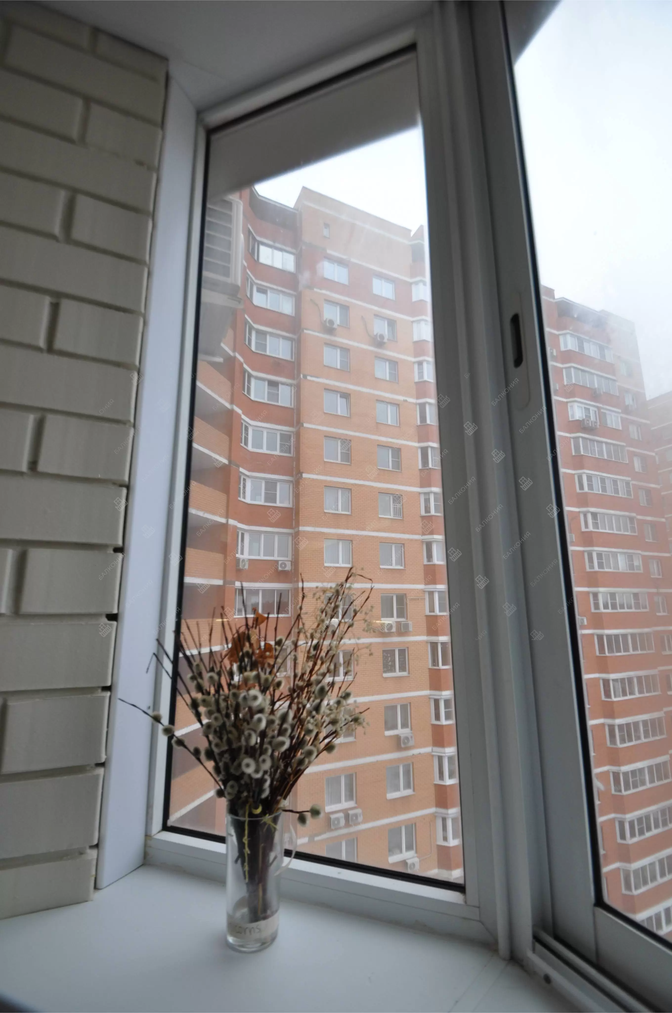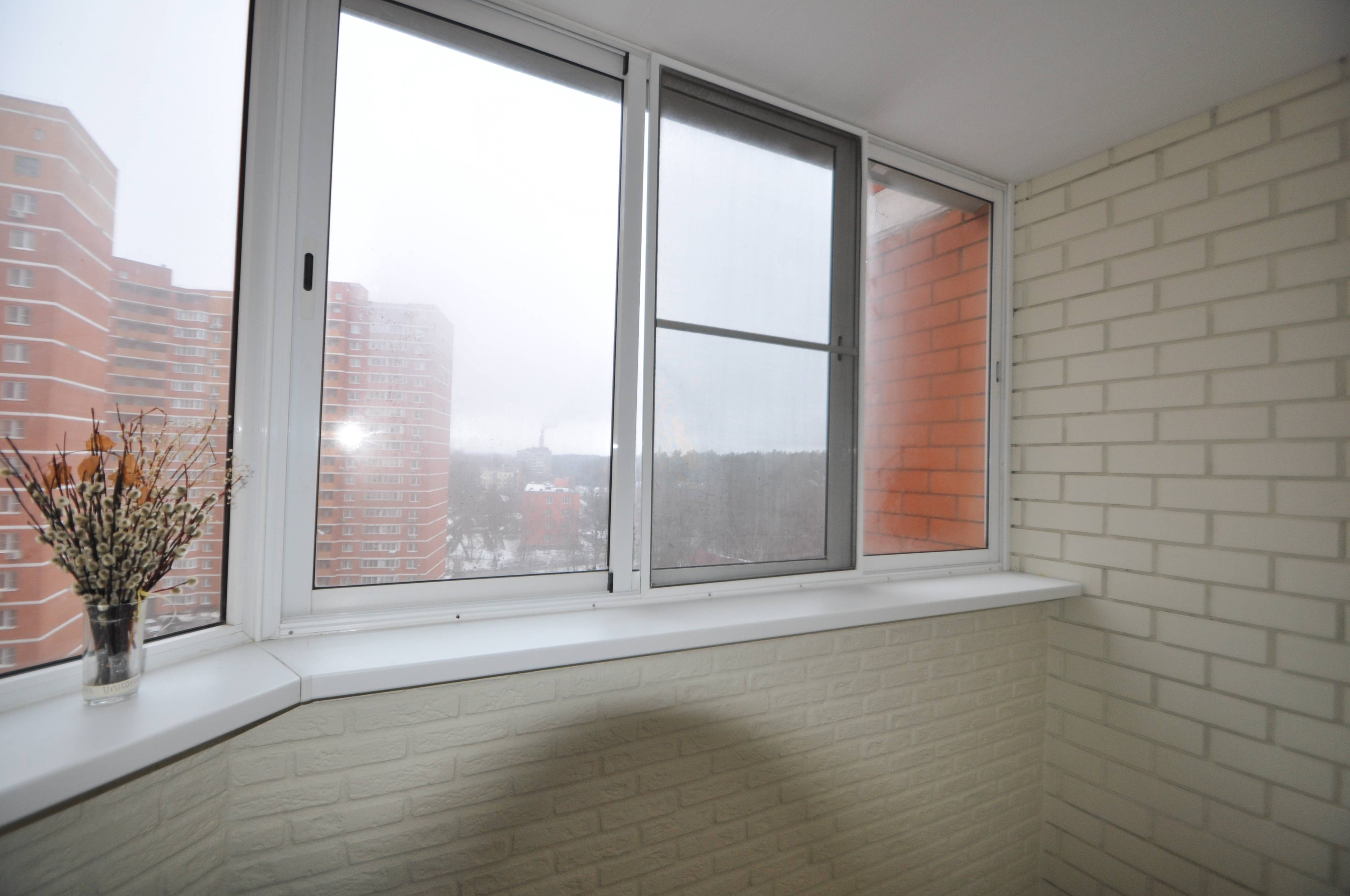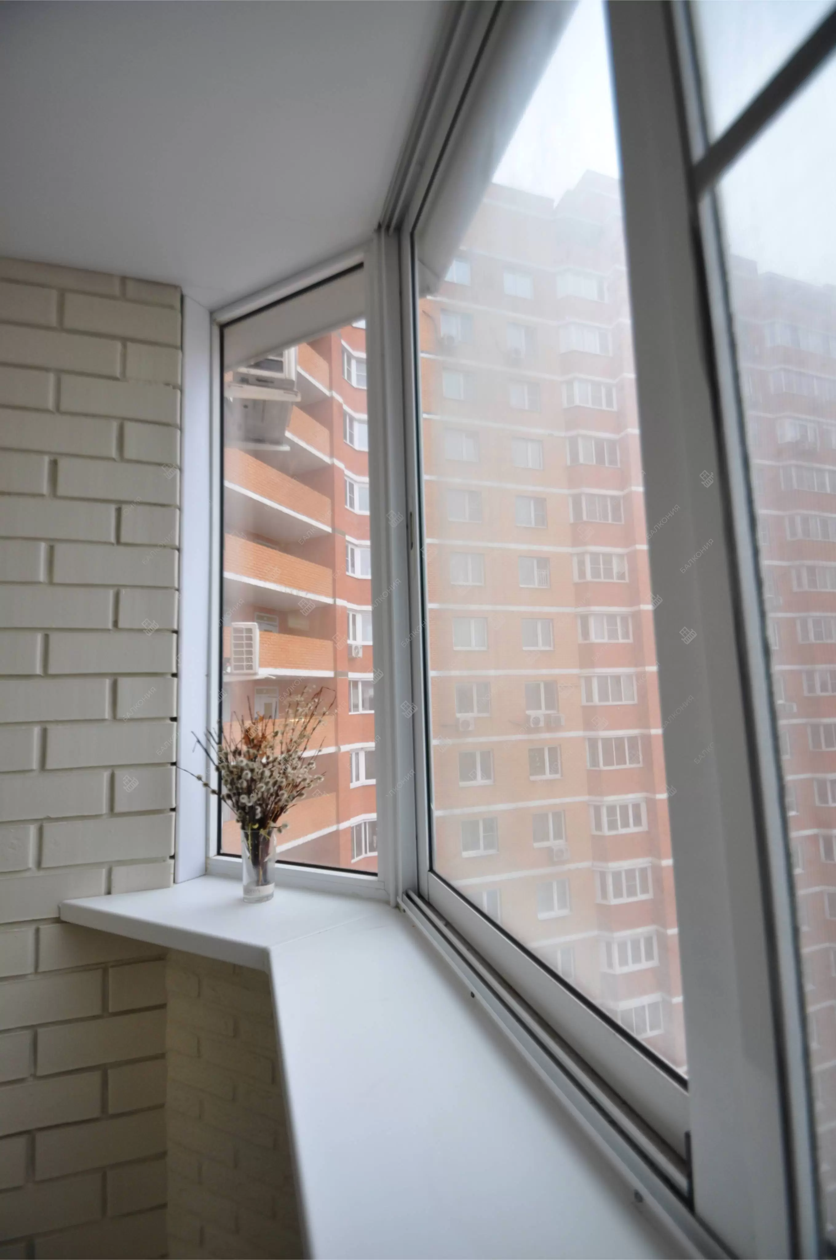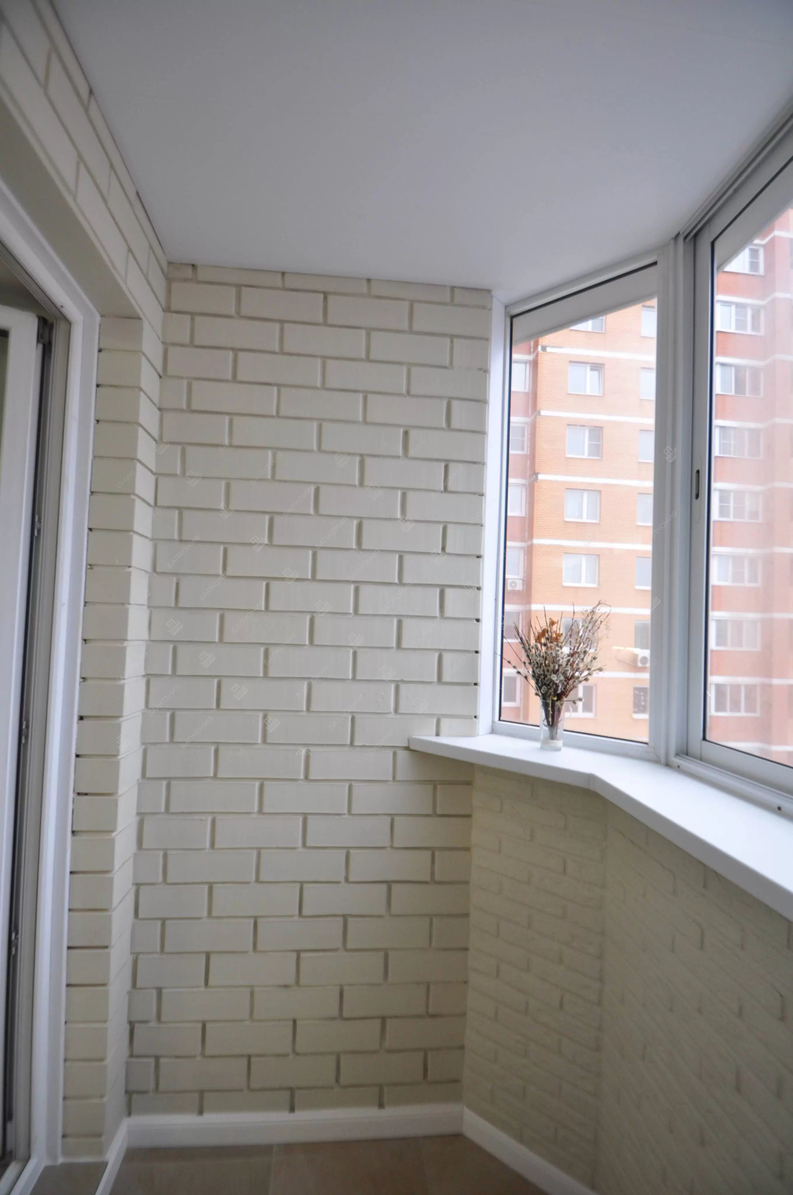 Произведена отделка балкона "Лодочка"  под ключ с холодным остеклением в А-серии дома. Сделано остекление балкона алюминиевыми окнами PROVEDAL,  в многоквартирном кирпичном доме. Отделка стен выполнена декоративным кирпичом плюс покраска, пол — плитка.  Материал предоставлялся компанией «Балкония» согласно пожеланиям заказчика.