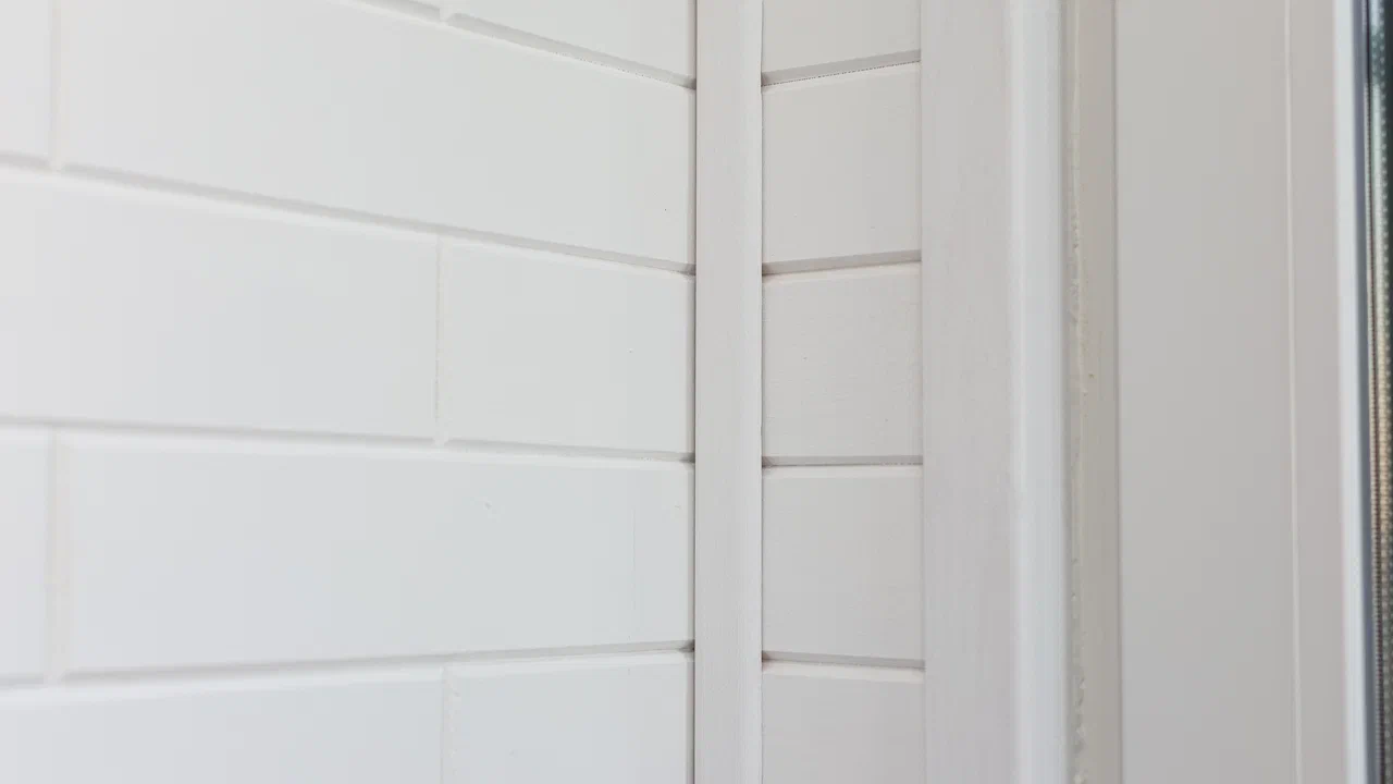 Светлый интерьер: стены из стенового паркета в белой покраске.