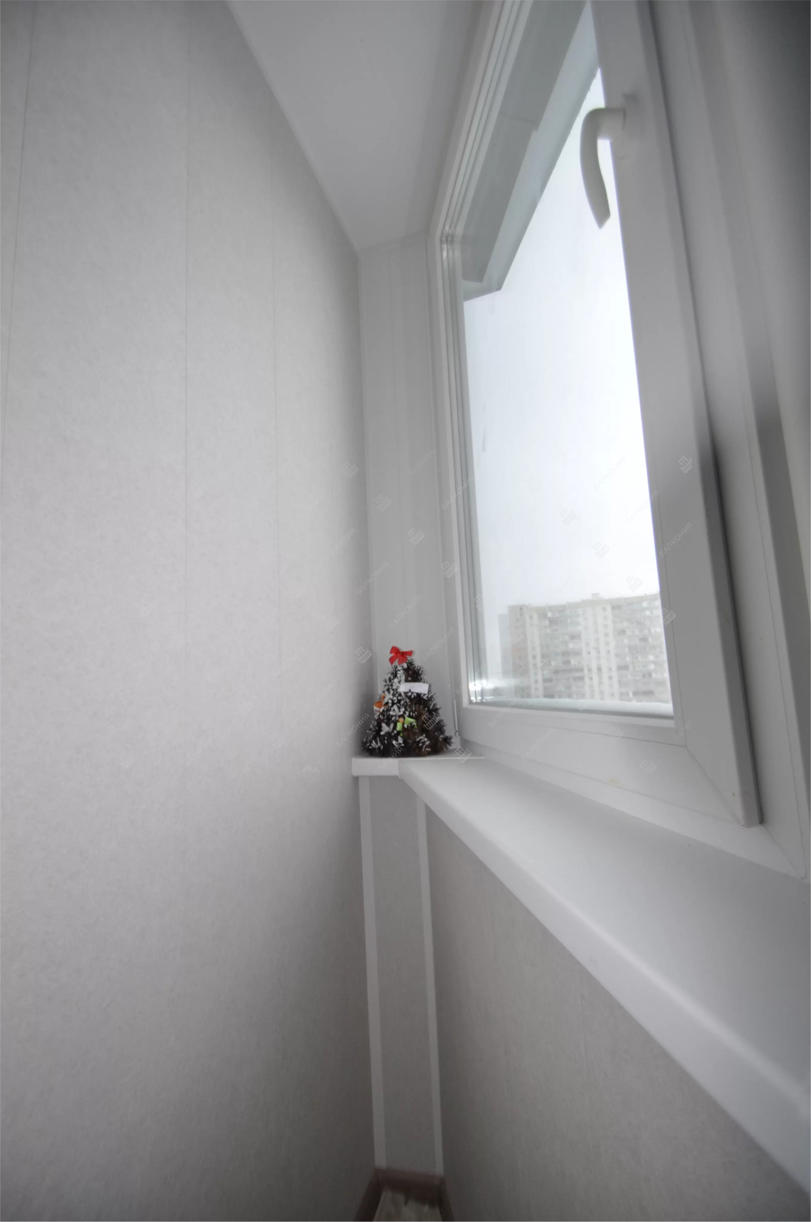 Произведена отделка балкона "сапожок"  в серии дома П-44  под ключ с теплым остеклением ПВХ Рехау. Сделано остекление балкона, в многоквартирном кирпичном доме. Отделка стен и потолка выполнена панелями ПВХ, полы — ламинат.  Материал предоставлялся компанией «Балкония» согласно пожеланиям заказчика.
